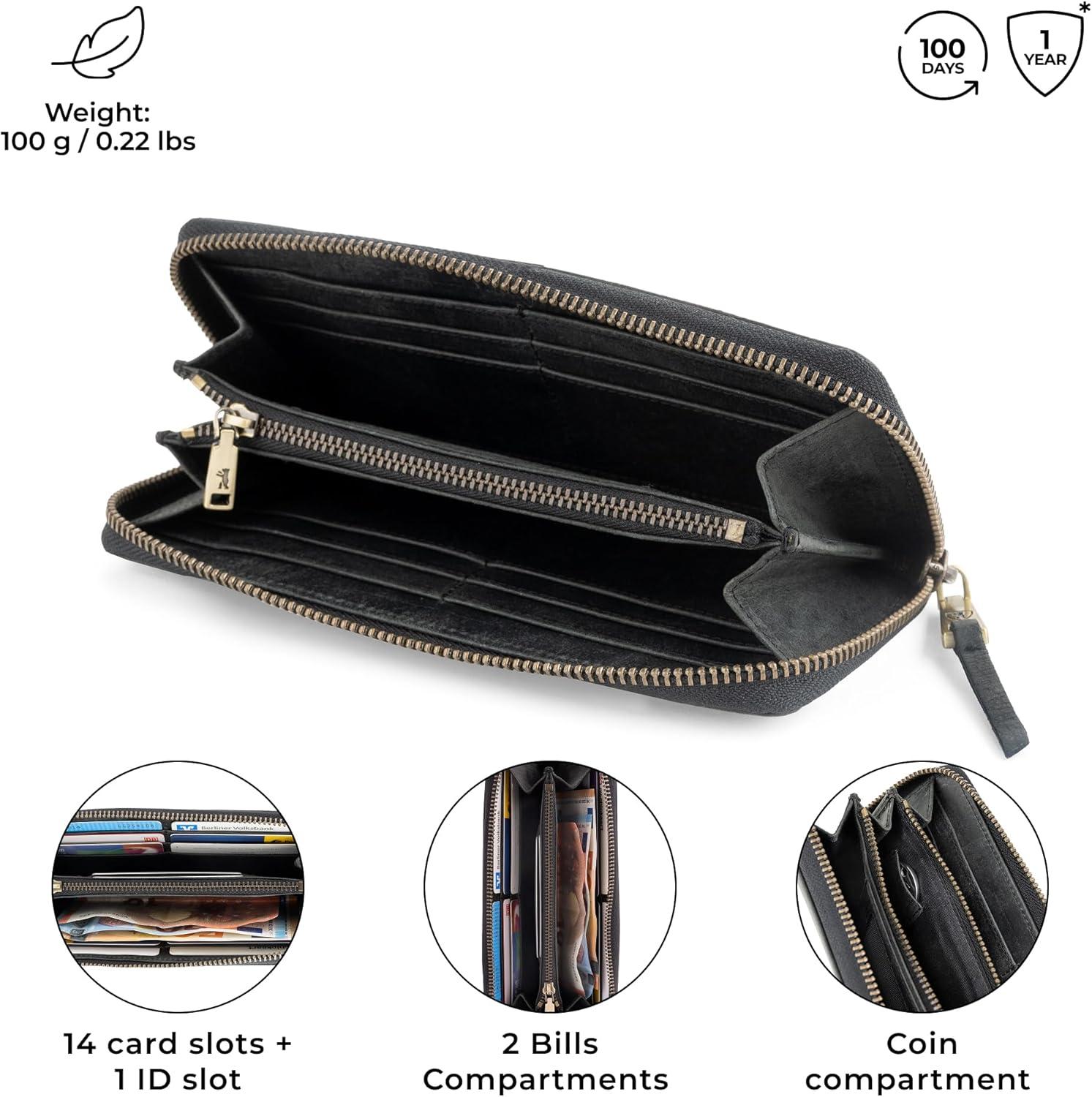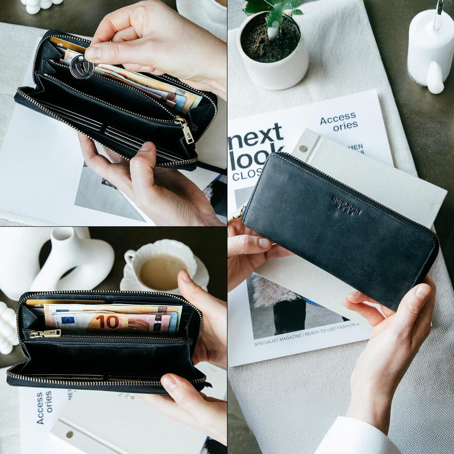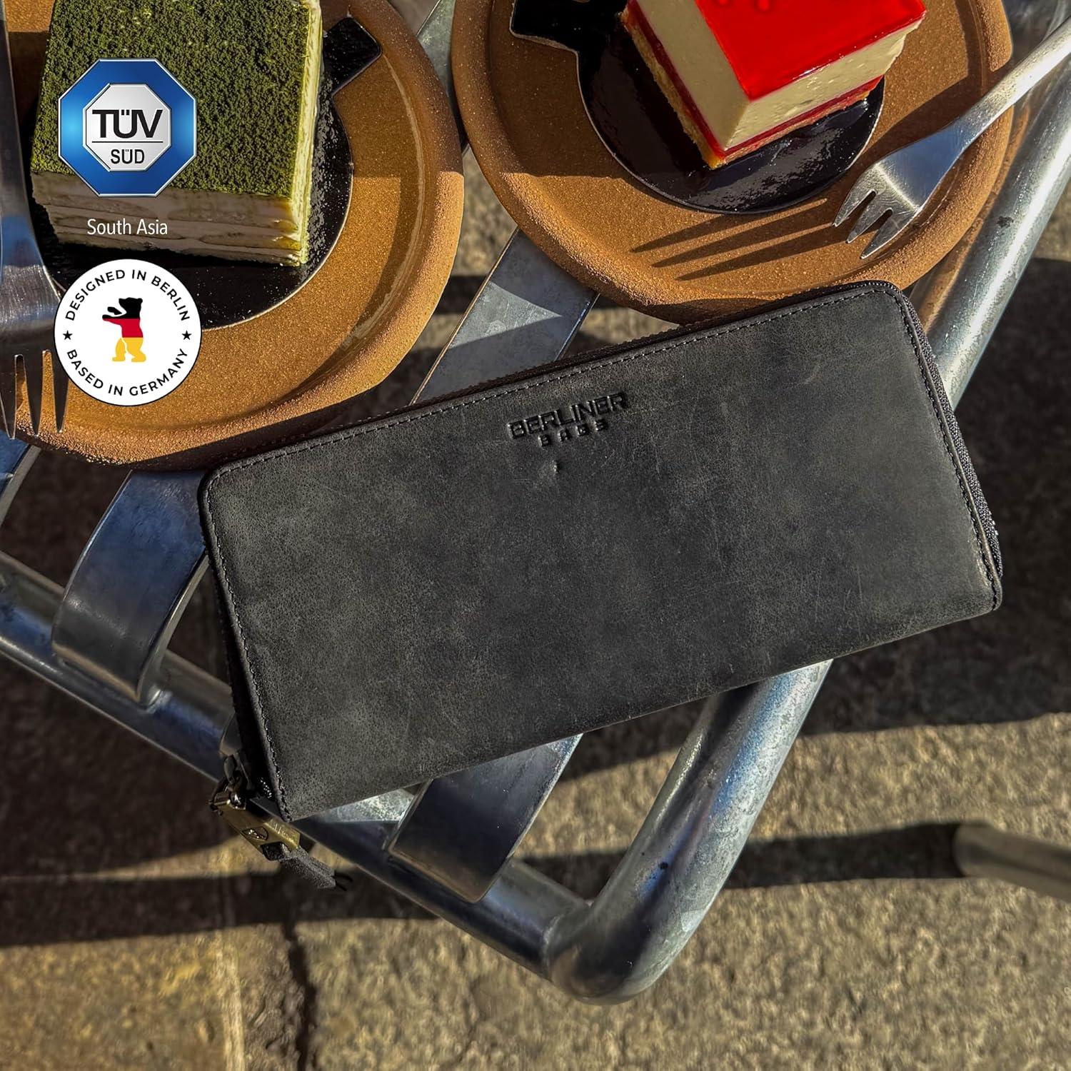 BERLINER BAGS Vintage Genuine Leather Wallet Palma, RFID Blocking Credit Card Holder, Slim Womens Wallet, Zip Around Wallet for 14 Cards, Bills, Coins, ID Window – Dark Grey(Black)